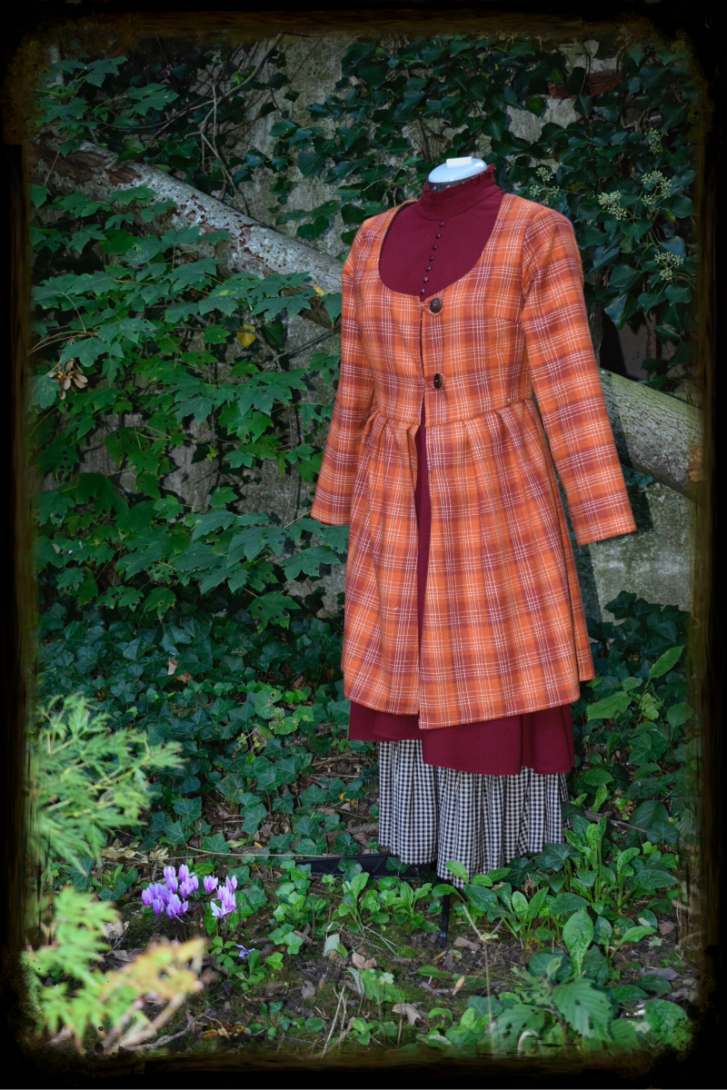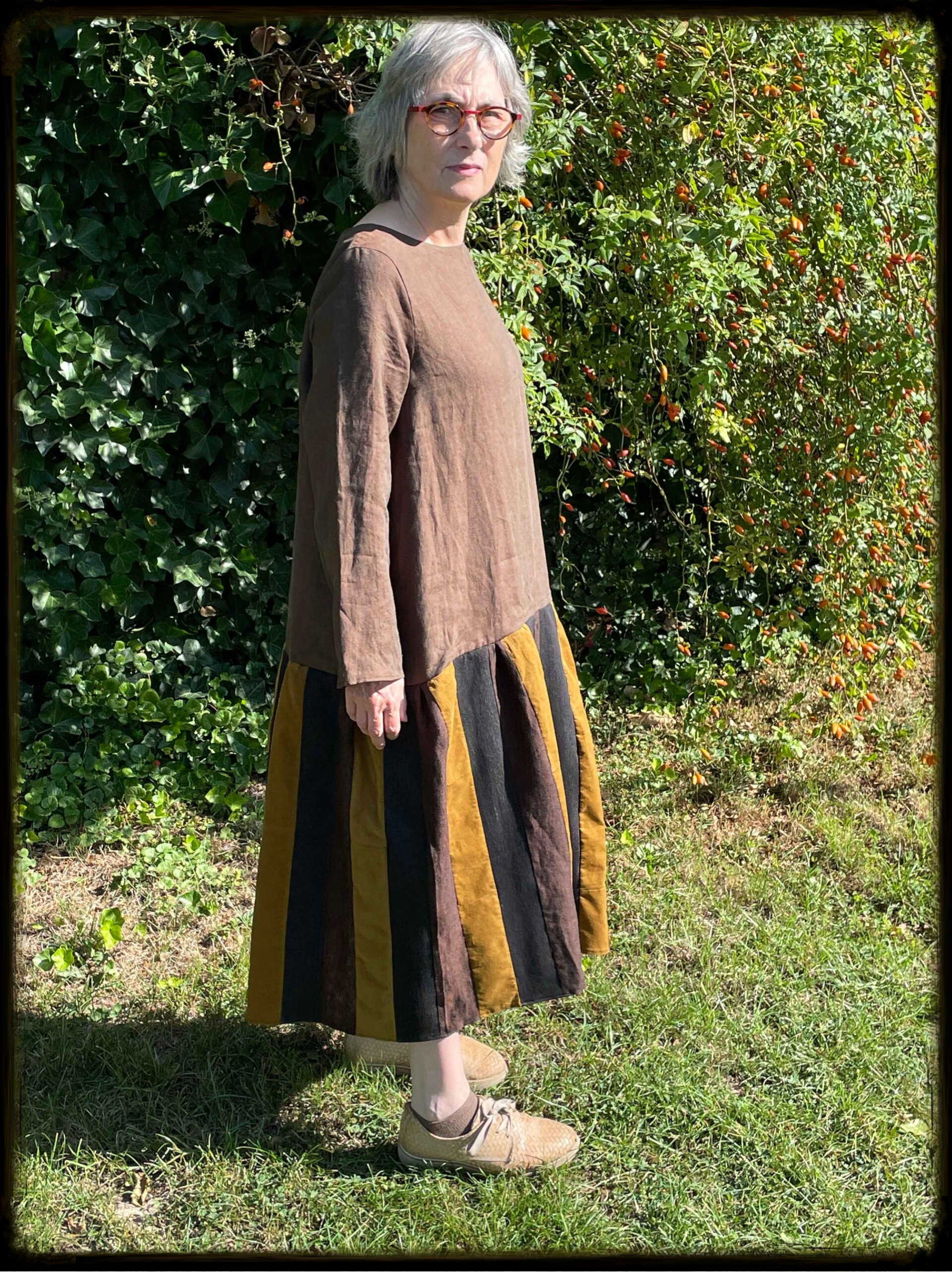 In my stash I came across the three fabrics you see in the skirt; one is a corduroy, the others are heavy linen. After cutting them in stripes of about 3 inches (7.5cm), I sewed them together. The result pleased me. Only then I came up with the idea to use the new made fabric in a dress as a skirt. For the top I used a pattern I found on Etsy.