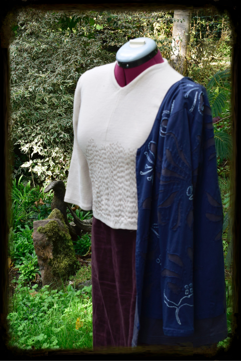 The work of this fashion designer inspires me. She uses mainly organic cotton jersey, combines 2 layers, embroiders patterns upon the upper layer, then cuts out part of this layer. It gives beautiful results!