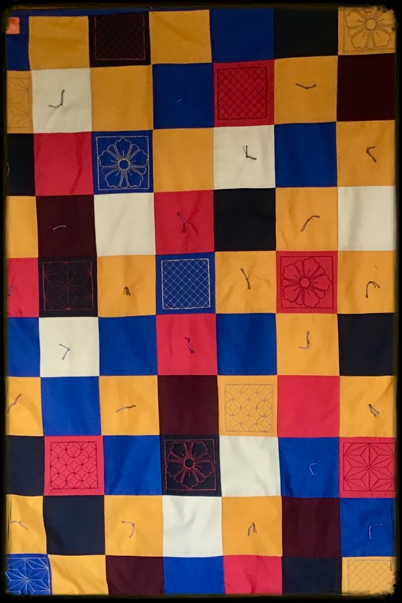This quilt is made from upcycled fabric. In the thriftstore I found these curtains. The colors spokt to me. Once I figured out how to arrange the blocks, I decided to add an extra touch! Adding blocks with machine embroidered images, completed the quilt.
