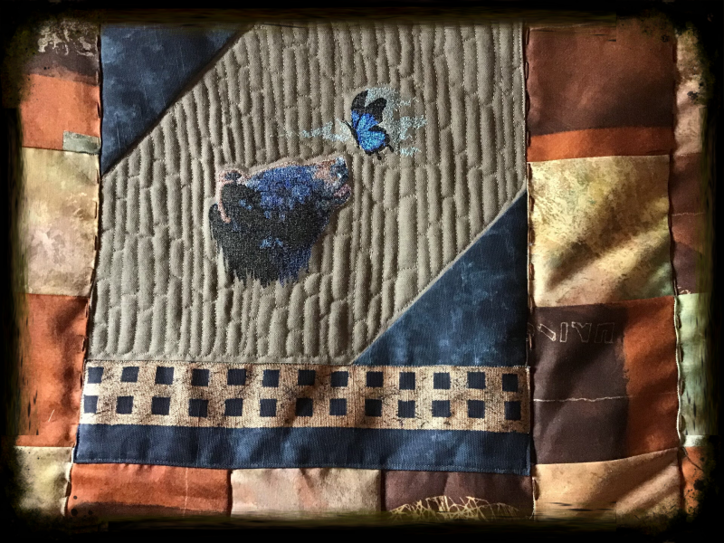 My husband digitized the bear and butterfly pattern which was embroidered on fabric. Freemotion quilting finished the block.