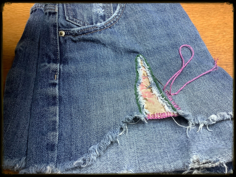 Wait! Did you consider visible mending? This pair of shorts with its huge tear is mended. First an under patch in a favorite fabric is stitched, followed by hand embroidery.